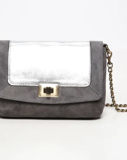Sac bandoulière en Cuir & Velours de Cuir d'Agneau Gaby argenté/gris - 21x15x7 cm