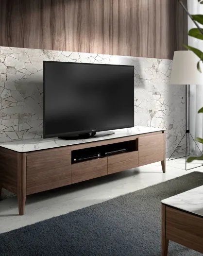Meuble TV deux portes et deux tiroirs noyer/argenté - 180x56x46 cm