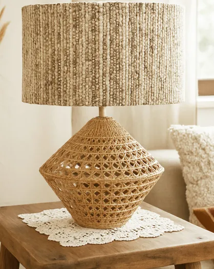 Lampe à poser en Rotin & Tweed fait main Lina naturelle - 36x36x48.5 cm