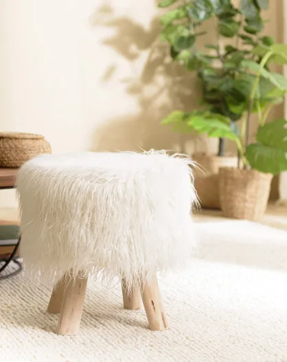 Tabouret rond en Fausse Fourrure Sacha ivoire - D.40x43 cm