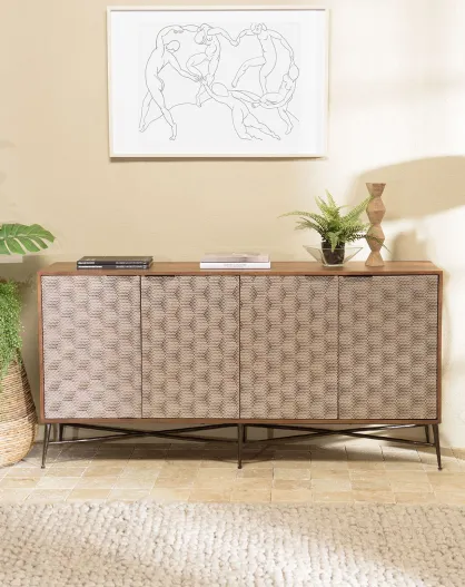 Buffet en Manguier 4 portes motifs ethniques bois - 168x46x86 cm