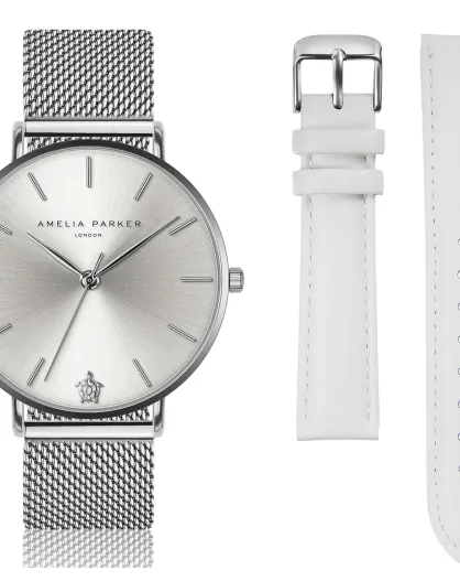 Set Montre Femme 2 Bracelets Capsule en Acier & Cuir argenté/blanc