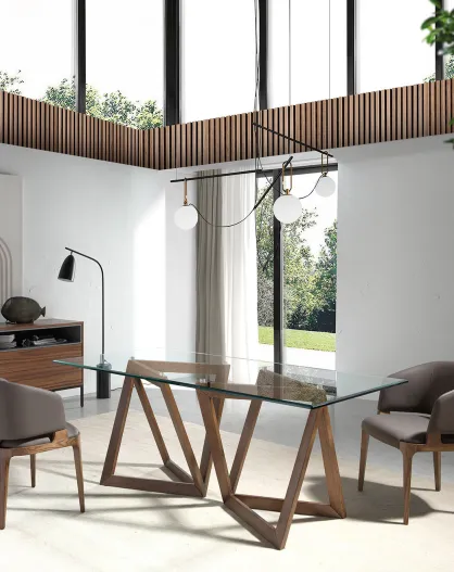 Table à manger avec plateau en verre trempé biseauté verre/noyer - 180x90x75 cm