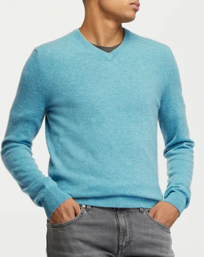 Pull 100% Cachemire col V Uni Nachve bleu