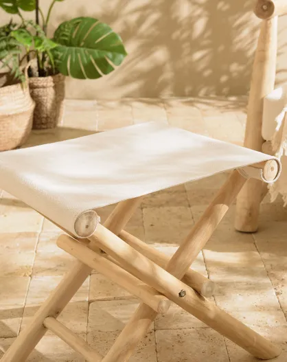 Tabouret pliant en branches de teck assise tissu will naturel - 50x37x45 cm