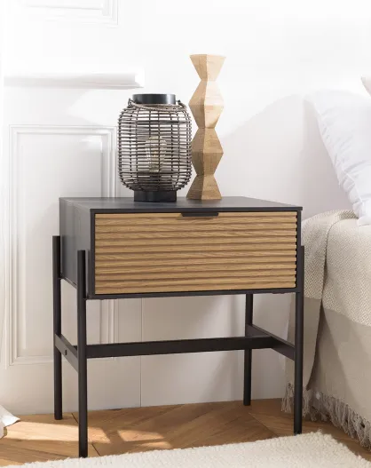 Chevet pin pieds métal charlie noir/bois - 51x40.5x54 cm