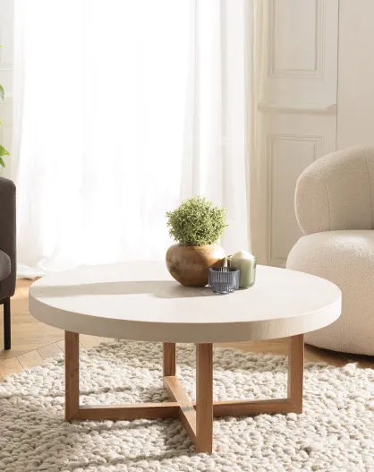 Table basse ronde en béton pieds en teck Dak beige - 92x92x41 cm