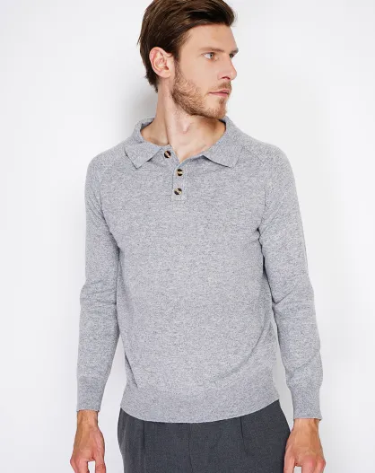 Pull col teddy boutonné en Coton gris chiné clair