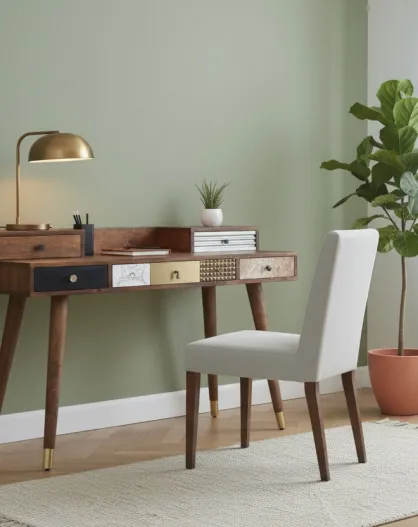 Bureau multi-matériaux peau de vache bois sculpté Naturel - 130x45x88 cm