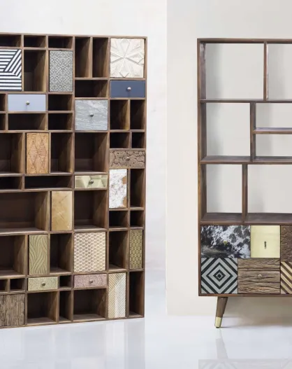 Bibliothèque multi-matériaux peau de vache bois sculpté Manguier Terranova