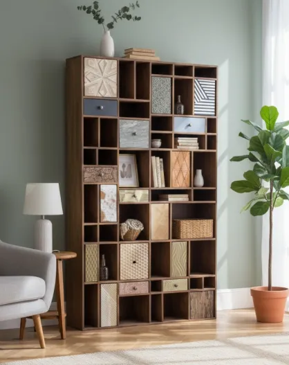 Bibliothèque multi-matériaux peau de vache bois sculpté Naturel - 115x30x200 cm