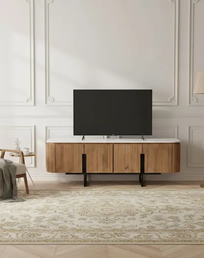 Meuble TV bas 4 portes plateau marbre blanc Manguier Kfir II Marron - 140x42x50 cm