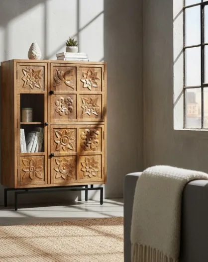 Buffet haut 3 portes Manguier Sculture Beige - 90x40x135 cm