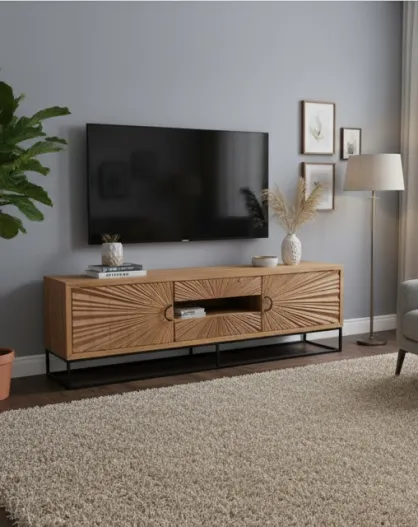 Meuble TV 2 portes 2 tiroirs Manguier Solaris Beige - 160x42x50 cm