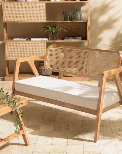 Canapé FLORES 2 p. en teck dossier cannage naturel coussin gris