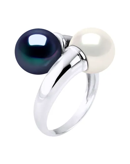 Bague Argent & Perles de Culture d'eau Douce Rondes blanc naturel/noir