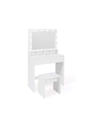Coiffeuse Zita blanche avec miroir LED, 4 niches, 1 tiroir et 1 tabouret