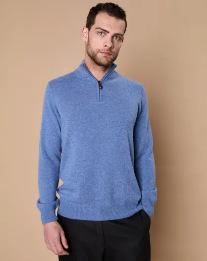 Pull 100% Cachemire John col camionneur bleu denim/gris