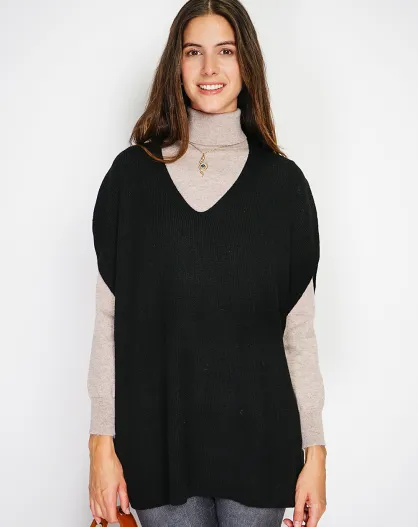 Pull poncho en Cachemire & Soie mélangé col V tricotage fantaisie noir