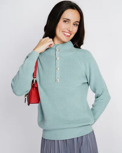 Pull en Cachemire & Soie mélangés col montant boutonné jade