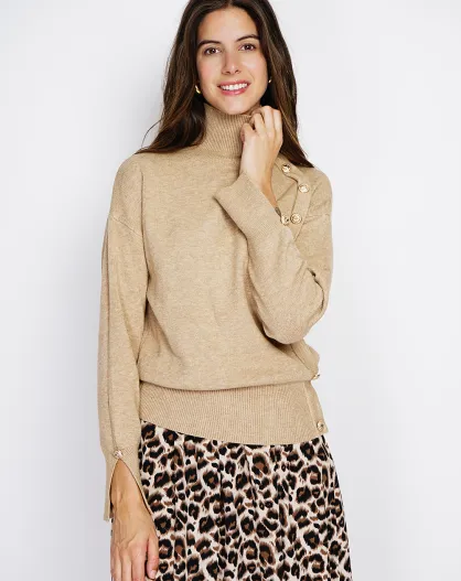 Pull en Cachemire mélangé col montant boutons dorés camel