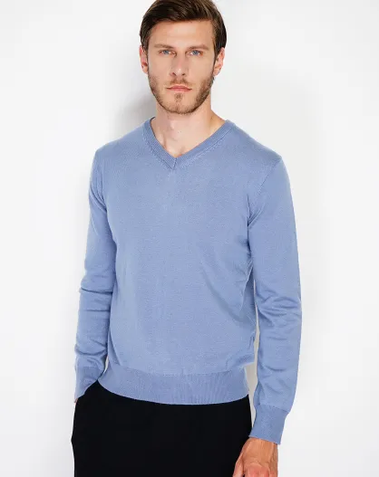 Pull en Cachemire & Soie col V 2 fils bleu jeans