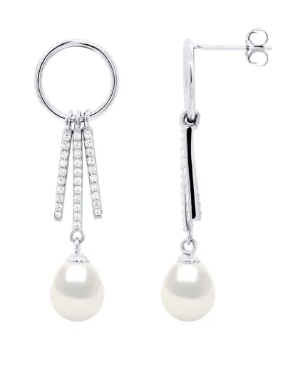 Boucles d'Oreilles en Argent Rond et Barettes Zirconium Perle de Culture d'Eau Douce Poire blanches