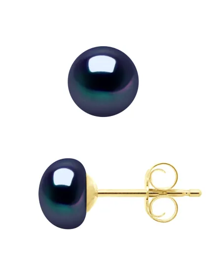 Boucles d'Oreilles en Or Jaune Perles de Culture d'Eau Douce Boutons noires