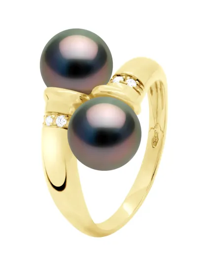 Bague Toi et Moi en Or Jaune Diamants Véritables Perles de Culture de Tahiti Rondes peacock