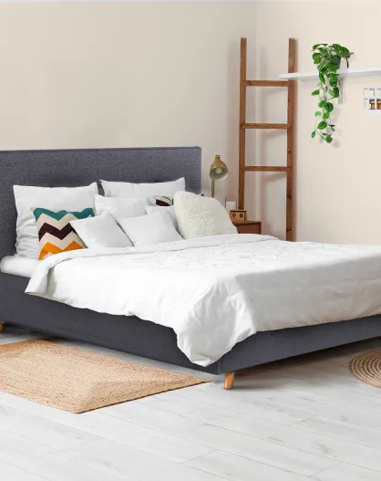 Lit coffre Mala en tissu gris avec sommier et tête de lit capitonnée 140x190cm