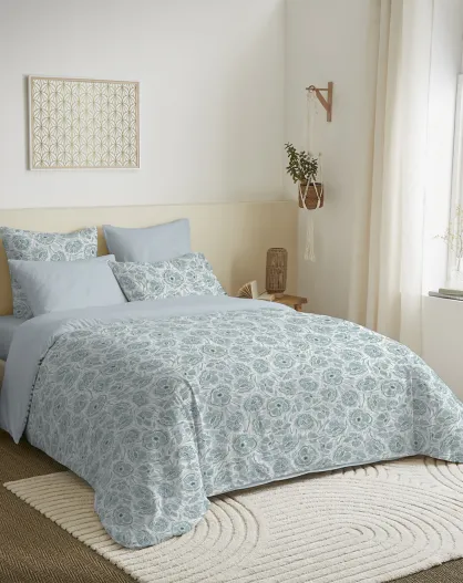 Pack Housse de couette imprimée + Drap housse + 4 Taies d'oreiller céladon - pour lit 160x200 cm