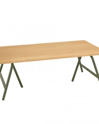 Table basse plateau en pin et pieds tréteaux en métal vert