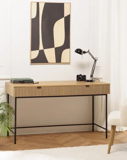 Bureau 2 tiroirs décor effet bois rainuré noir et naturel SCOTT