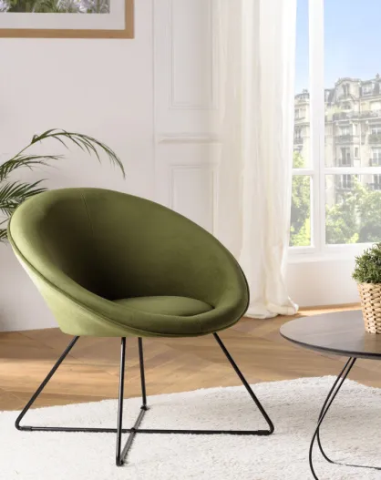 Fauteuil tissu velours vert olive pieds croisés métal noir AGATHE