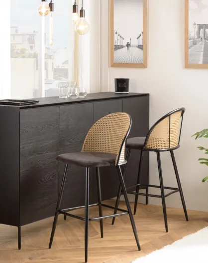 LEA - Lot de 2 tabourets d'ilot assise tissu noir dossier effet cannage