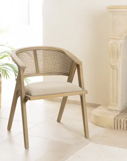 PIERRE - Chaise en bois assise tissu couleur lin dossier rotin naturel