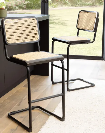 PIERRE - Lot de 2 tabourets d'ilot bois noir/rotin naturel pieds métal