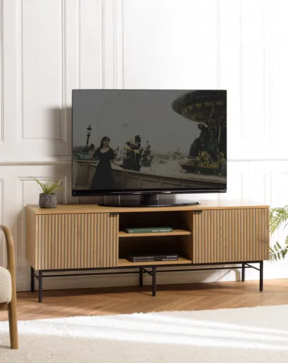 SCOTT - Meuble TV 2 portes 2 niches décor effet bois rainuré noir/naturel