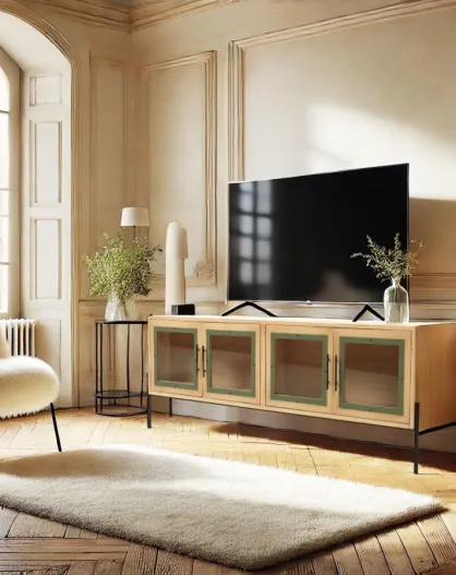 Meuble TV 4 portes vitrées encadrement vert pin et métal noir