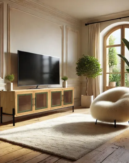 Meuble TV 4 portes vitrées encadrement vert pin et métal noir