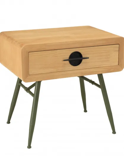 Chevet 1 tiroir en pin couleur naturelle et pieds métal vert