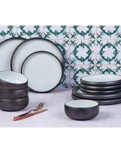 Service Les Essentiels en Grès Gourmet blanc granité/noir onyx - 12 pièces