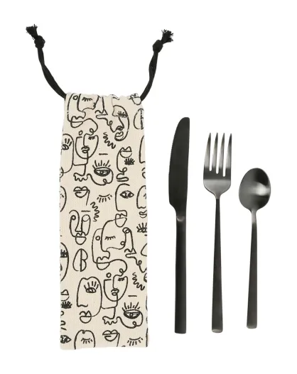 Set Pochette et 3 Couverts Terre Brulé écru/noir