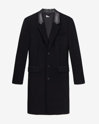 Manteau noir long en mélange de laine avec détails en cuir