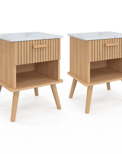 2 Tables de chevet Marceau effet lattes bois/effet marbre blanc - 40x34x50 cm