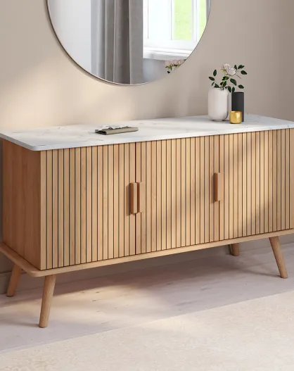 Buffet Marceau 3 portes effet lattes et dessus marbre bois/effet marbre blanc - 110x40x60 cm