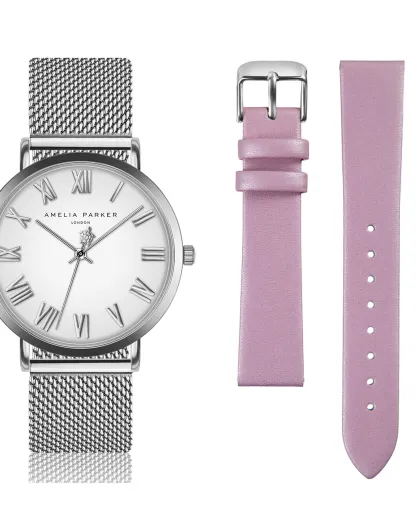 Set Montre Femme 2 Bracelets Grand Blanc en Acier & Cuir argenté/rose
