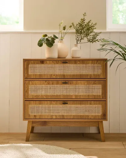 Commode 3 tiroirs avec façades en rotin et pieds en bois l80 cm - alia