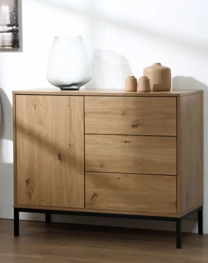 Commode 1 porte 3 tiroirs décor chêne l90 x h80 cm - lenny