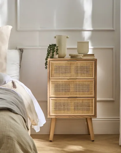 Table de chevet 3 tiroirs façade en cannage rotin naturel - miya
